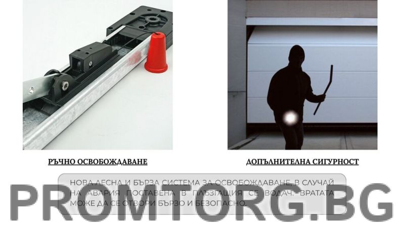 Лесна за използване система за освобождаване в случай на спешност. Благодарение на своята практичност, вратата може да се отключва и отваря по бърз и безопасен начин. Плъзгащите водачи TAU с дебелина от само 3 см, гарантират минимални изисквания за пространство и са особено подходящи за използване в гаражи с ниски тавани. Гладка и безшумна работа на гаражните врати.